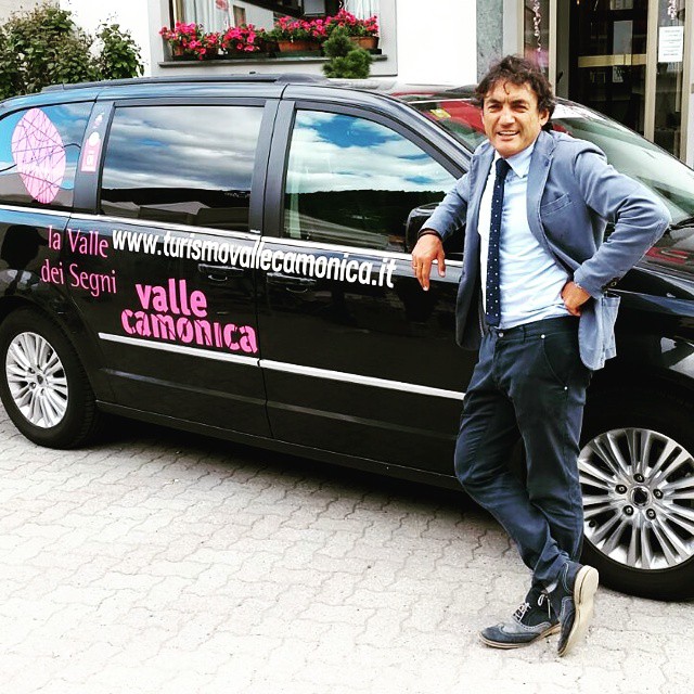 Il mitico Claudio #Chiappucci in posa per la #vallecamonica con l’auto della #valledeisegni in versione pink. Siamo belli anche in rosa, c’è poco da fare! #giro2015 #giro 16^ tappa pinzolo-aprica http://ift.tt/1AtUURR