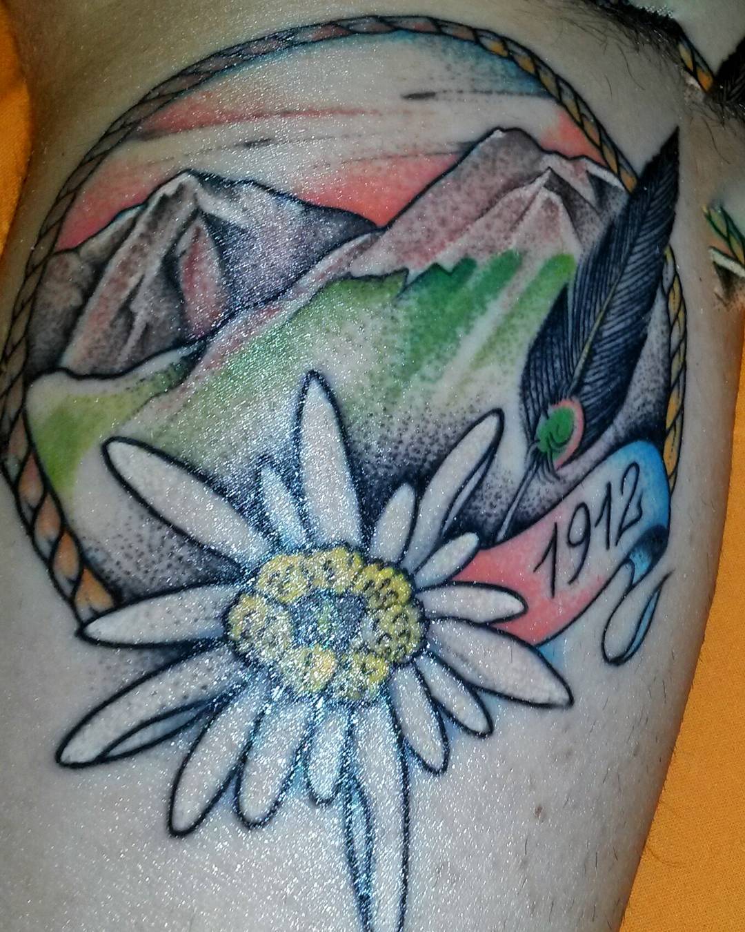 #tattoo #traditional #oldstyletattoo #traditionaltattoos #2016 #1912 #mountaintattoo #lozio #vallecamonica #stellalpina #edelweiss #italy made by @italianrooster